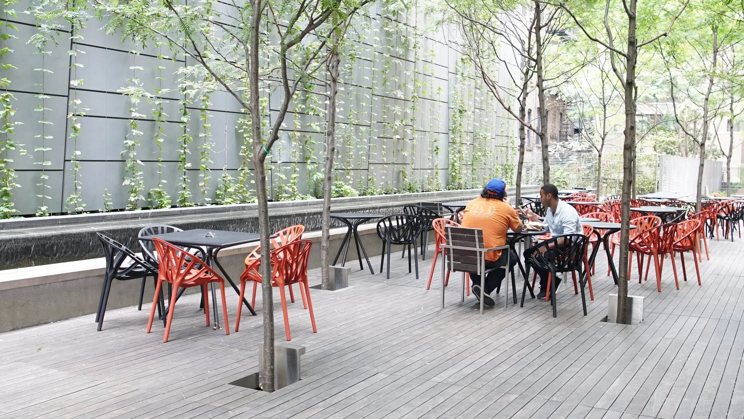 Belfer Terrace connects Ennead’s new Weill Cornell Belfer Research Building with student and resident housing in the Lasdon House. The terrace was inspired by Paley Park’s Honeylocust grove and water wall, and similarly provides a respite from a busy neighborhood.