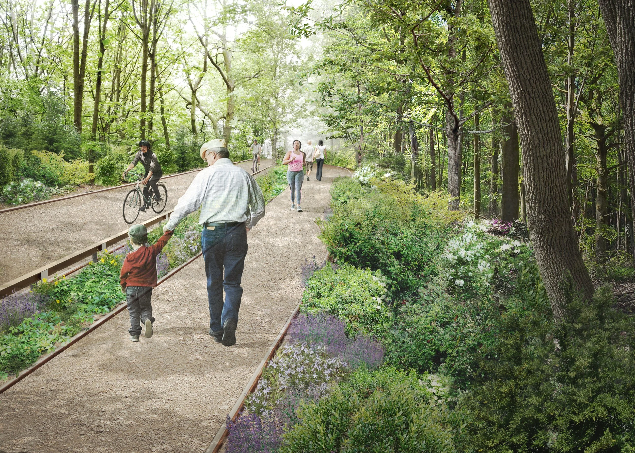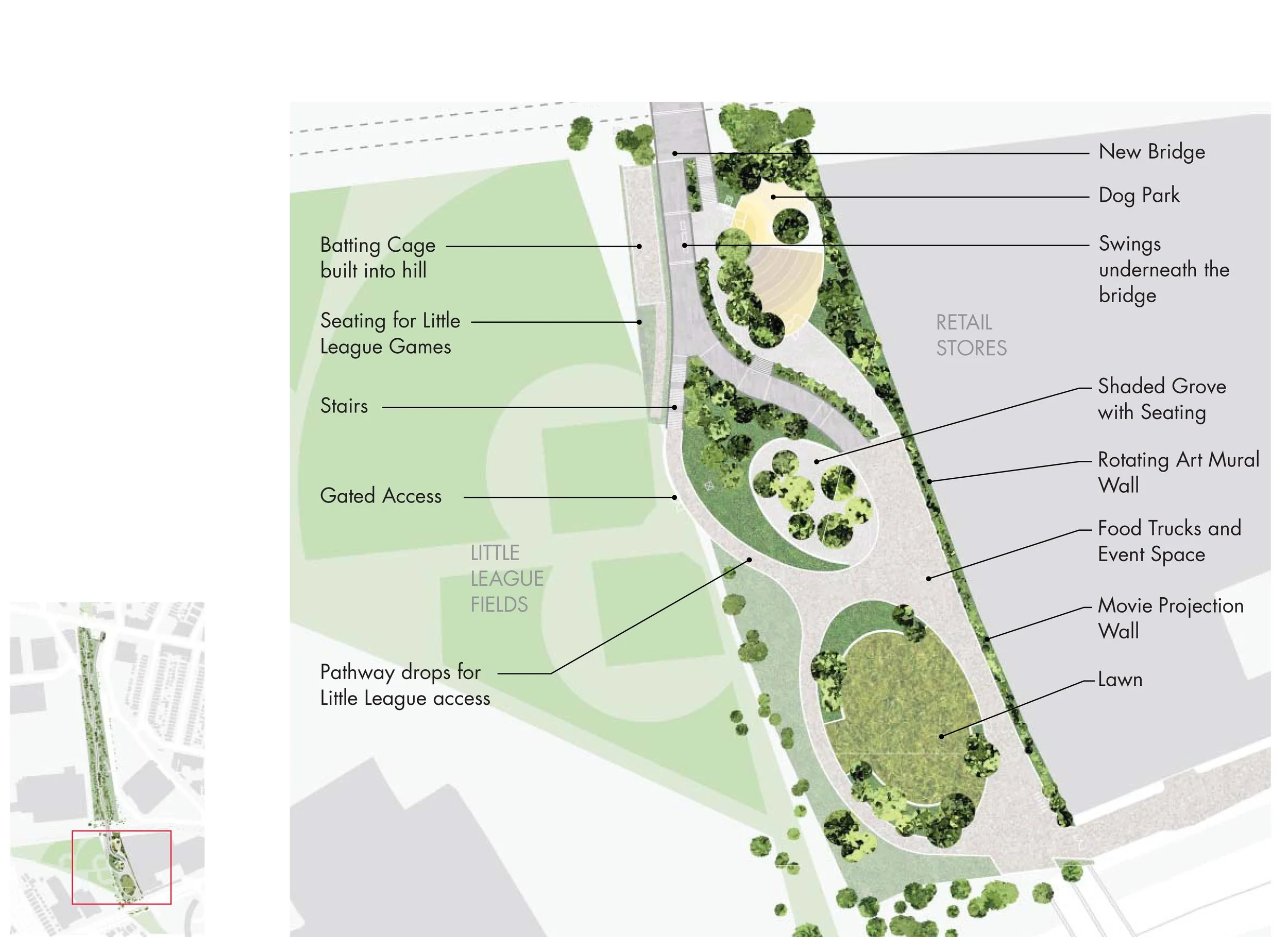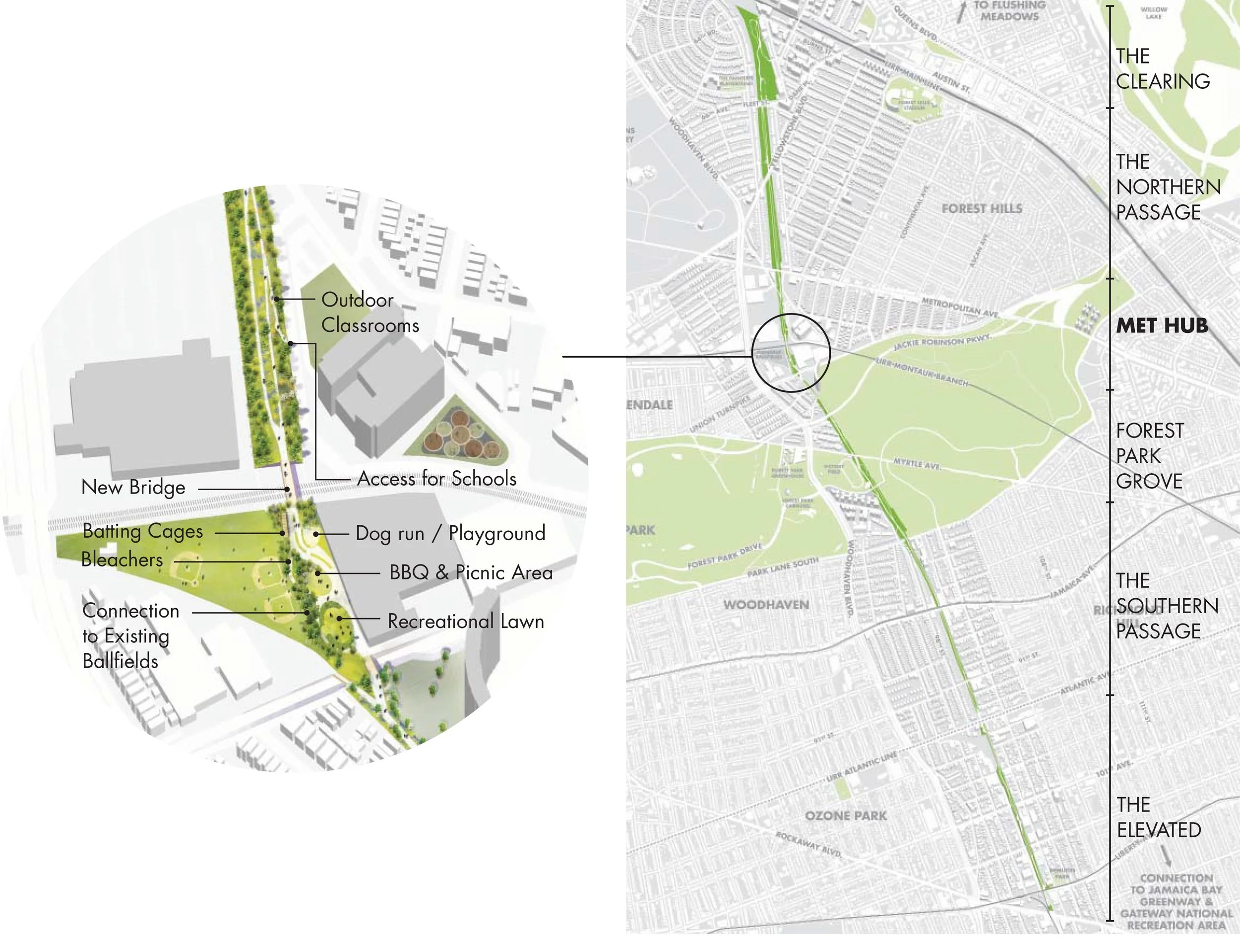 The Met Hub is the first half mile section of QueensWay. This first section, project managed through design development by Ms. Bentson, will provide a continuous bike and pedestrian path connection to Forest Park. Amenities will be provided to expand the current uses of the adjacent spaces, which included providing outdoor classrooms for the adjacent MELS school, a new bridge for safe crossing to Forest Park, and practice areas for the adjacent Little League.